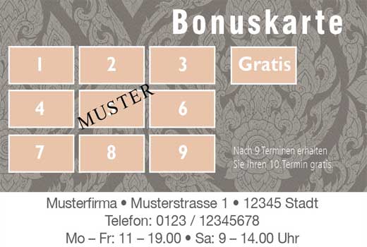 Es gibt kaum ein günstigeres Werbemittel als eine Bonuskarte bzw. Terminkarte, die Ihren Kunden nicht nur an den Termin erinnert, sondern generell an Ihre Dienstleistung.